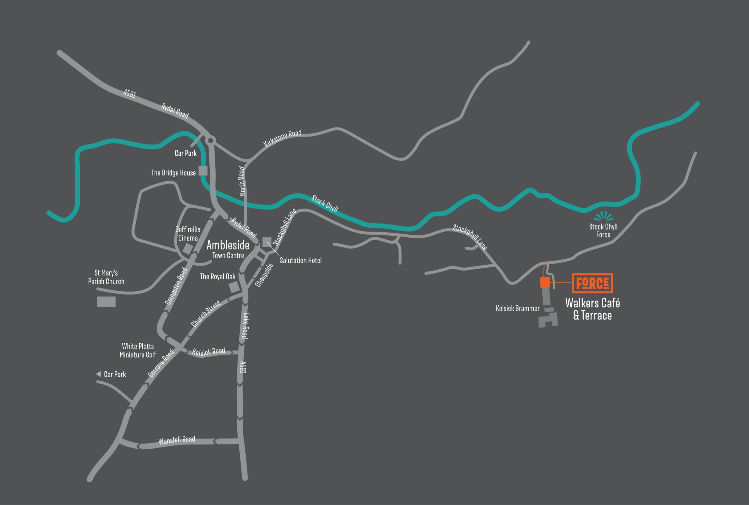 Find us at Stock Ghyll Lane, Ambleside - just a short walk from the town centre.